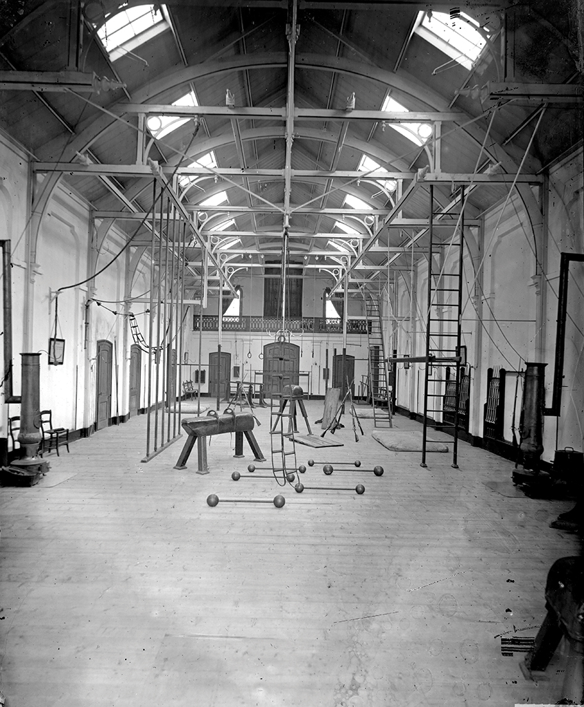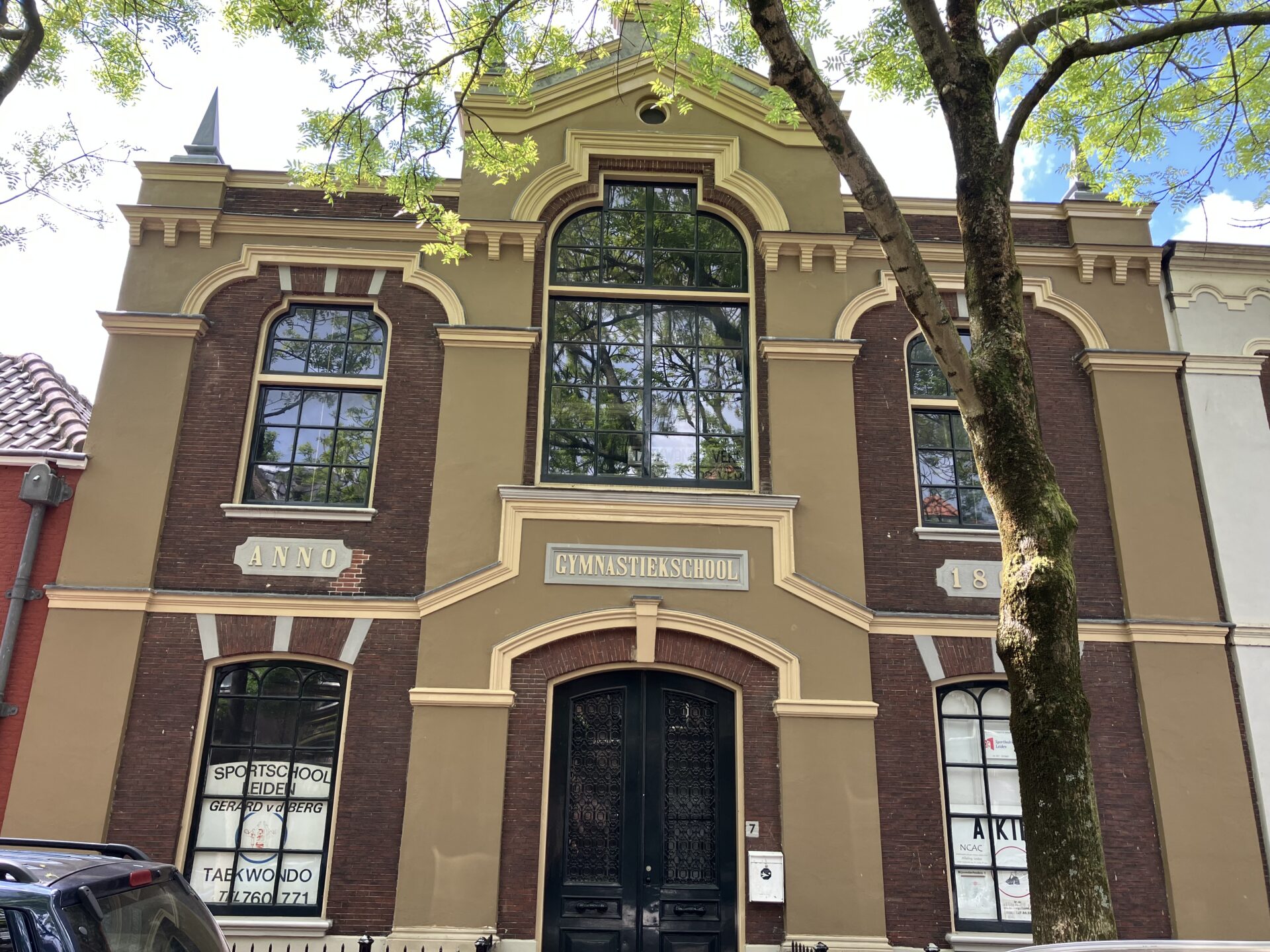 De Gymnastiekschool aan de Pieterskerkgracht werd in 1861 gebouwd in opdracht van de Maatschappij ‘Tot Nut van ’t Algemeen’ ten behoeve van de schoolgaande jeugd. De naastgelegen woning voor de beheerder werd tegelijkertijd gebouwd. De latere gemeente-architect Jan Willem Schaap bouwde de school volgens de destijds nieuwste opvattingen in eclectische trant. In de eclectische stijl worden elementen van verschillende bouwstijlen gekozen om tot een bevallig geheel te worden gecombineerd. De drie-assige voorgevel valt op door een omlijst spaarveld met de tekst ‘Gymnastiekschool’ en tussen de vensters boven de cordonlijst zijn friezen aangebracht met het opschrift ANNO en 1861. Zowel deuren als ramen zijn getoogd. De gevel wordt bekroond door vier zinken obelisken. Het interieur is nog grotendeels in oorspronkelijke staat. De kapconstructie bestaat uit acht samengestelde boogspanten, waarvan de voeten van de gebogen delen rusten op met kraagstukken bekroonde lisenen. Tussen de lengtebalken, die de spanten met elkaar verbinden, en de dwarsbalken van de spanten zijn ijzeren kwartbogen en cirkels aangebracht. De inrichting bevat nog de originele materiaalkasten en het materiaalhok. Ruim anderhalve eeuw later wordt het gebouw nog steeds gebruikt voor sport! / MB